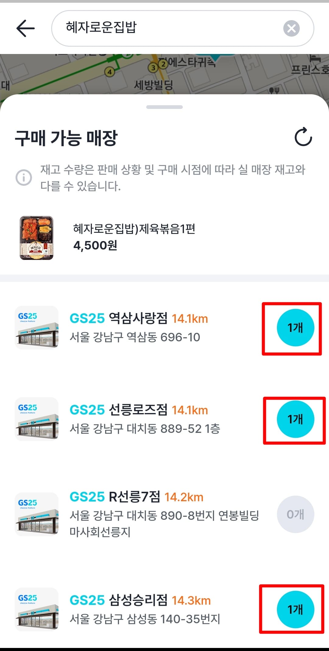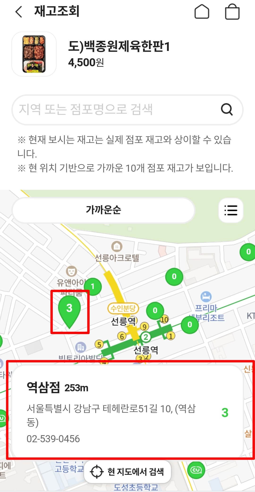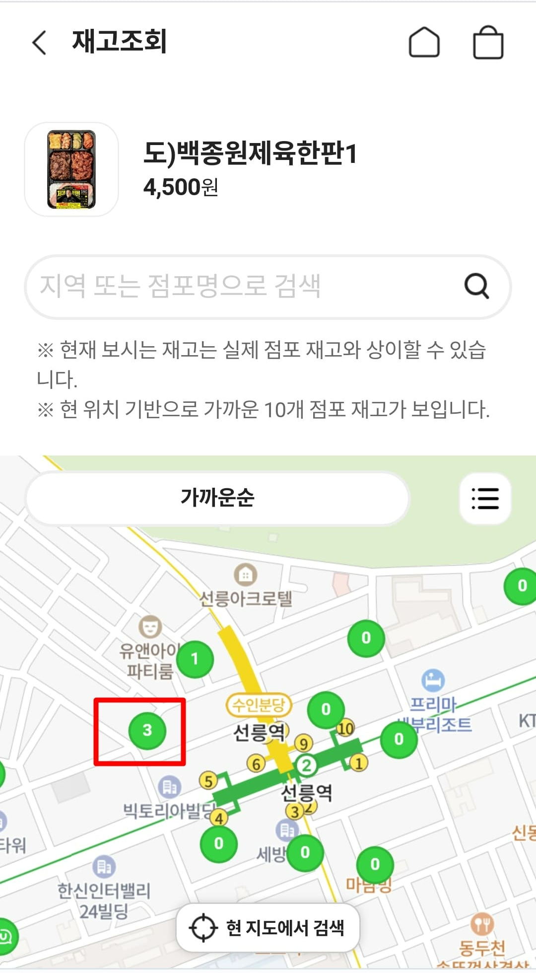 5. 아래와 같이 지도가 노출되며 위에서 선택한 상품의 재고개수가 지도 내 핀에 노출됩니다.