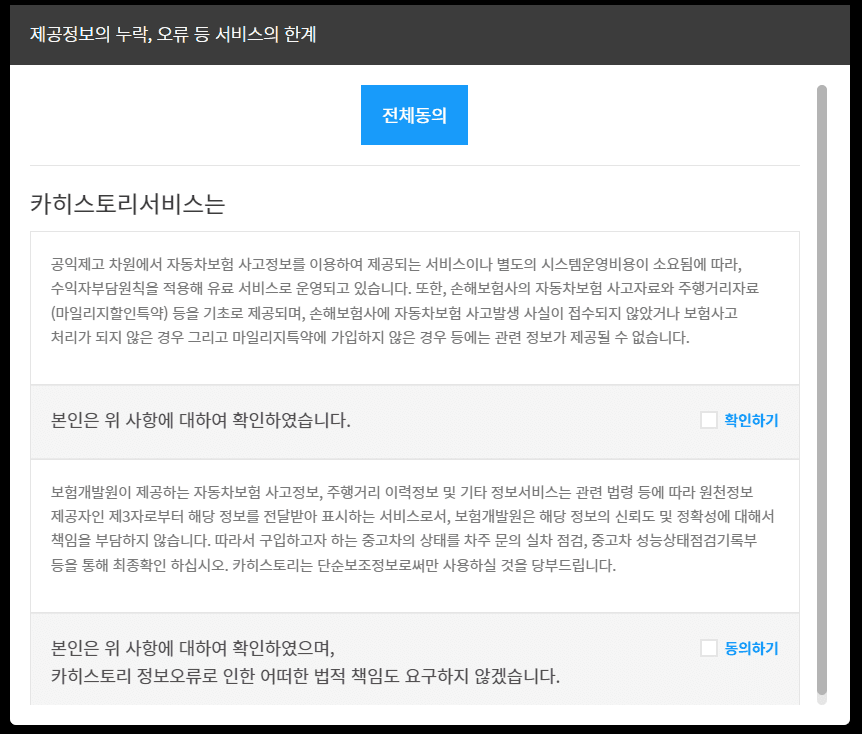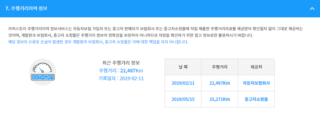 주행거리이력 정보서비스의 경우는 중고차 판매자 또는 자동차보험 가입자가 보험회사나 중고차 쇼핑몰에 직접 제출한 주행거리 자료를 제공받아서 그대로 노출하는 것이므로 참고 정보로만 활용하시기 바랍니다.