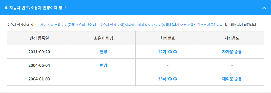 개인 간의 소유 변경(공동 소유인 경우에는 대표 소유자 변경도 포함) 이외에도 매매상사 간에 변경(상품용)까지 모두 포함되어 노출됩니다.