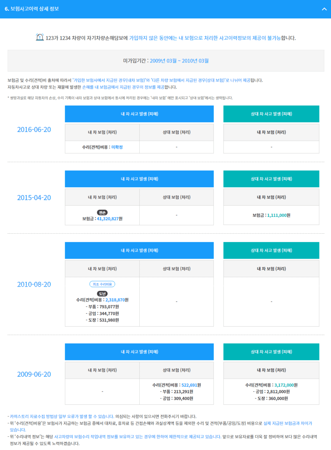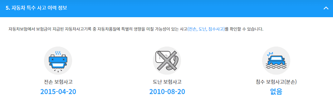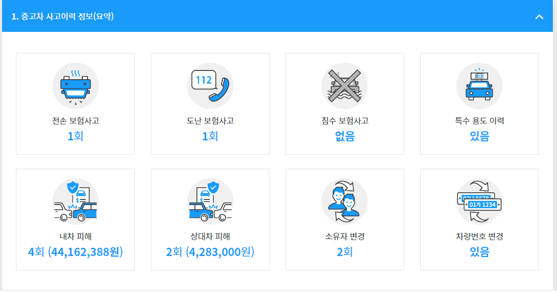 아래와 같이 사고이력정보가 요약되어 노출됩니다.