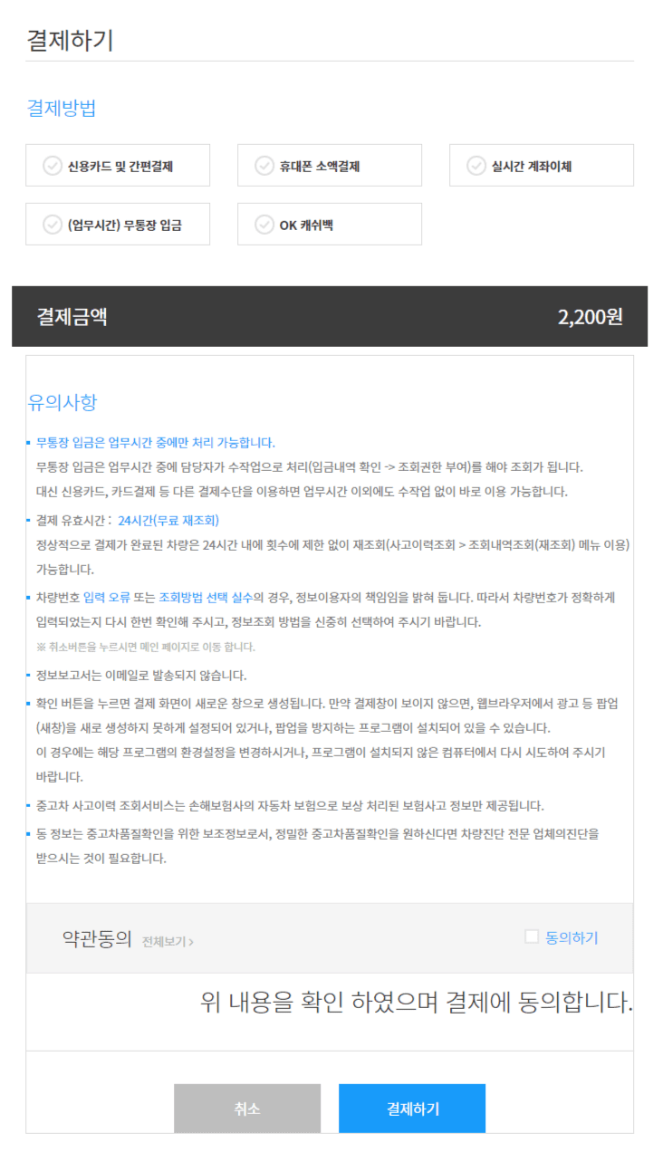 오늘은 중고차 구매 시 차량번호를 이용해 사고이력조회 및 침수이력을 조회하는 방법에 대해서 알아보았습니다.