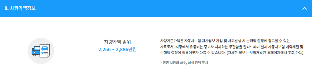 자동차보험 자차담보 가입 및 사고가 발생했을 경우 손해액 결정에 참고할 수 있는 차량 기준가액이 노출됩니다.
