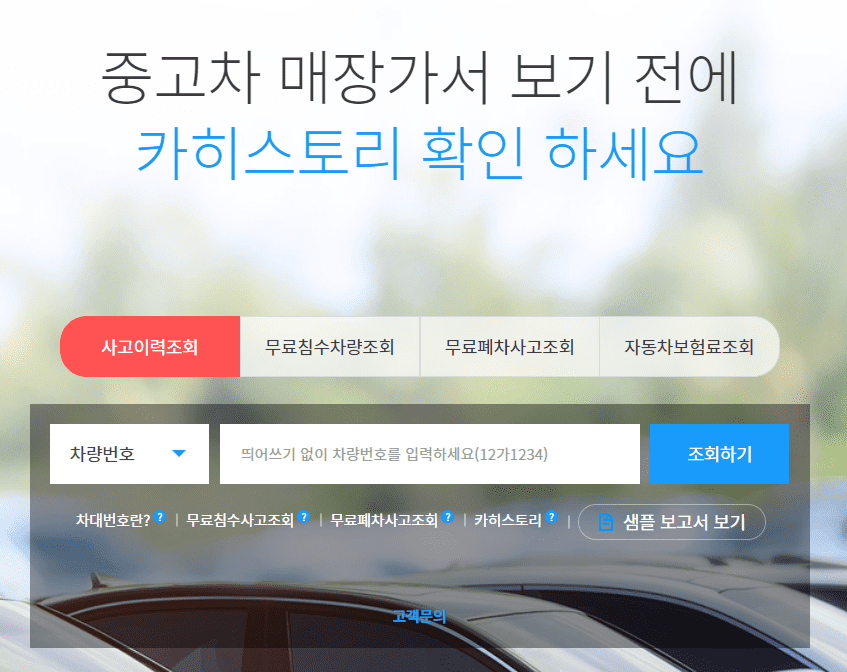 "카히스토리"라는 사이트에서 차량번호로 사건 이력 조회는 물론 무료 침수차량조회, 무료 폐차 사고조회, 자동차보험료 조회도 가능합니다.