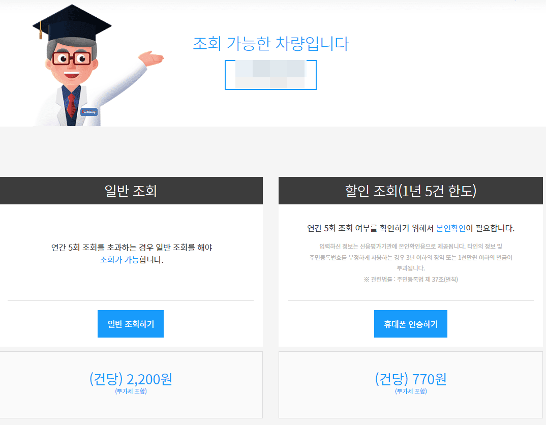 3. 아래와 같이 조회 가능한 차량인지 확인되며 '일반 조회', '할인 조회'로 나뉘어 노출됩니다.