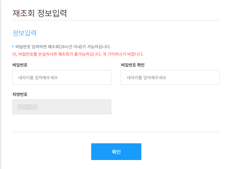 아래와 같이 재조회가 가능할 수 있게 비밀번호를 입력 후 [확인] 버튼을 선택해주세요.