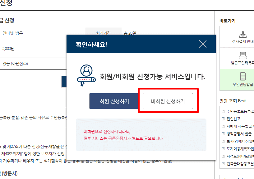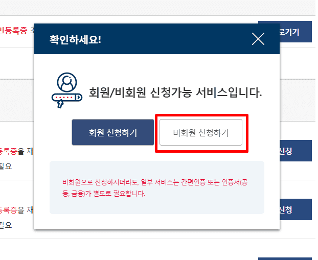 4. 회원/비회원 선택하는 팝업이 나오는데 저는 비회원으로 신청하도록 하겠습니다.