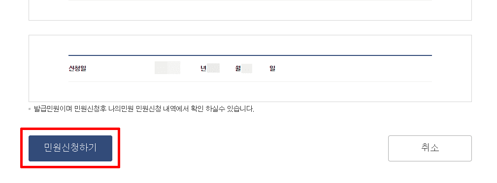 6-2. 위에 항목들을 전부 입력하셨다면 아래 [민원신청하기] 버튼을 선택하여 신청을 완료해주세요.