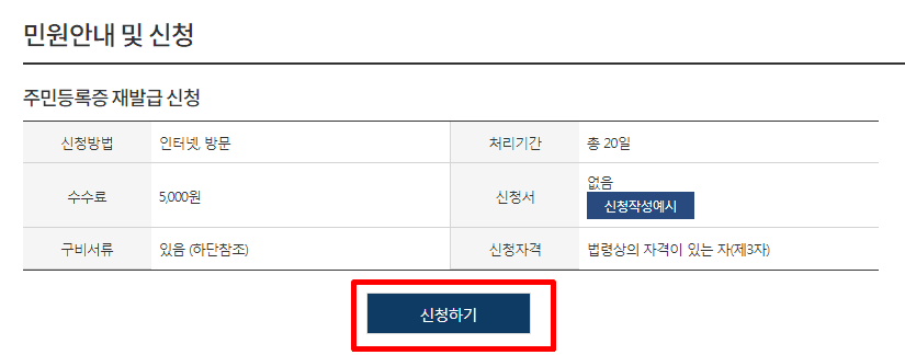 2. 주민등록증 재발급은 분실신고와는 다르게 수수료 5000원 있으며 처리기간이 20일인 것을 알 수 있습니다.