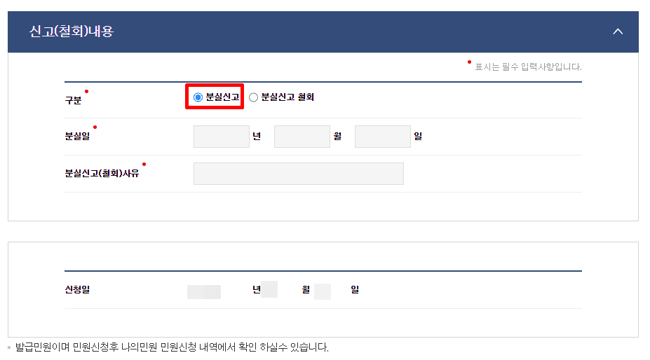 6. 그러면 아래와 같이 분실신고 화면으로 이동됩니다.
