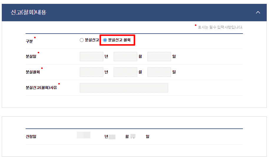'분실신고철회' 선택 시 입력해야하는 항목들입니다.