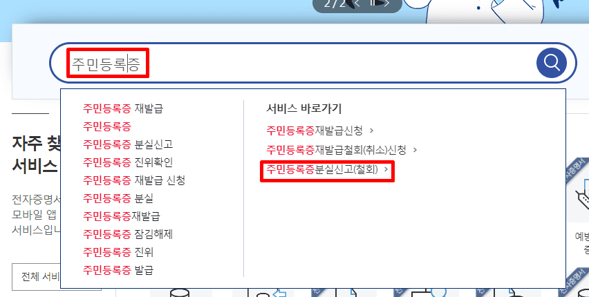 2. 정부24 사이트 내 검색창에 "주민등록증"을 입력하시면 아래와 같이 '주민등록증 분실신고(철회)' 메뉴가 노출됩니다.