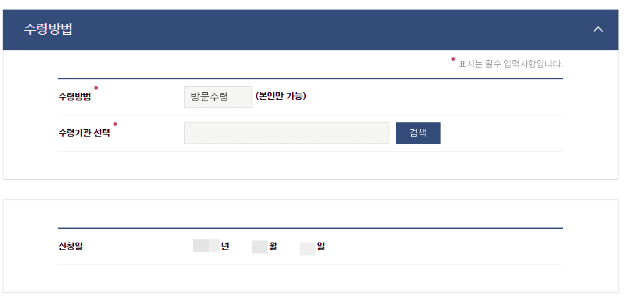 신청은 온라인으로 가능하지만 수령은 직접 방문만 가능합니다.