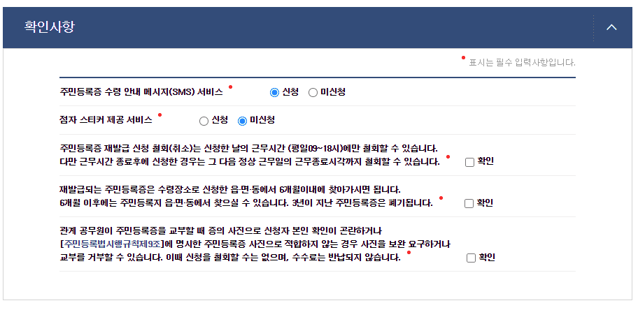 4-2. 확인사항 중 주민등록증 수령안내 메시지 sms 서비스 신청 여부, 점자 스티커 제공 서비스 신청 여부 등