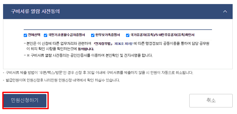 위의 모든 내용이 확인 되셨으면 [민원신청하기] 를 선택하셔서 신청 완료하시면 됩니다.