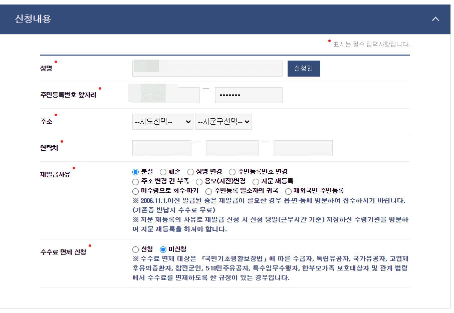 4-1. 신청내용 중 성명, 주민등록번호 앞자리를 확인해주시고 주소, 연락처, 재발급 사유를 선택해주세요