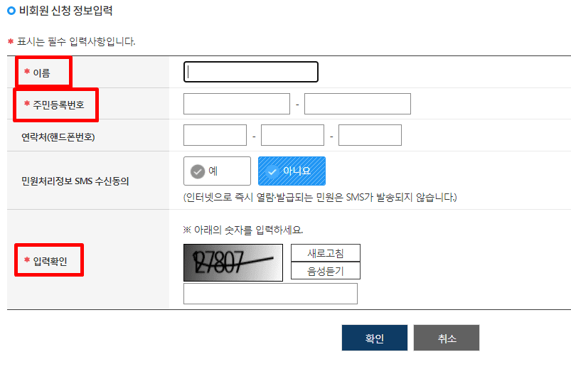그리고 하단 비회원 신청 정보 - 이름, 주민등록번호, 입력확인 문자를 입력하신 후 [확인] 버튼을 선택해주세요.