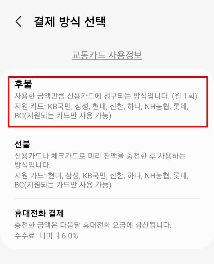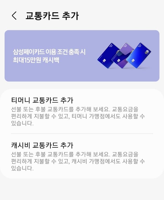 여기서 후불 교통카드로 등록할 때는 삼성 페이로 카드가 기존에 등록이 되어있어야 합니다.