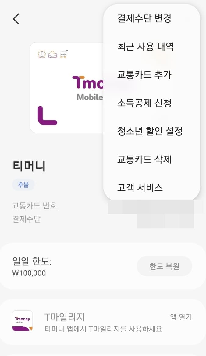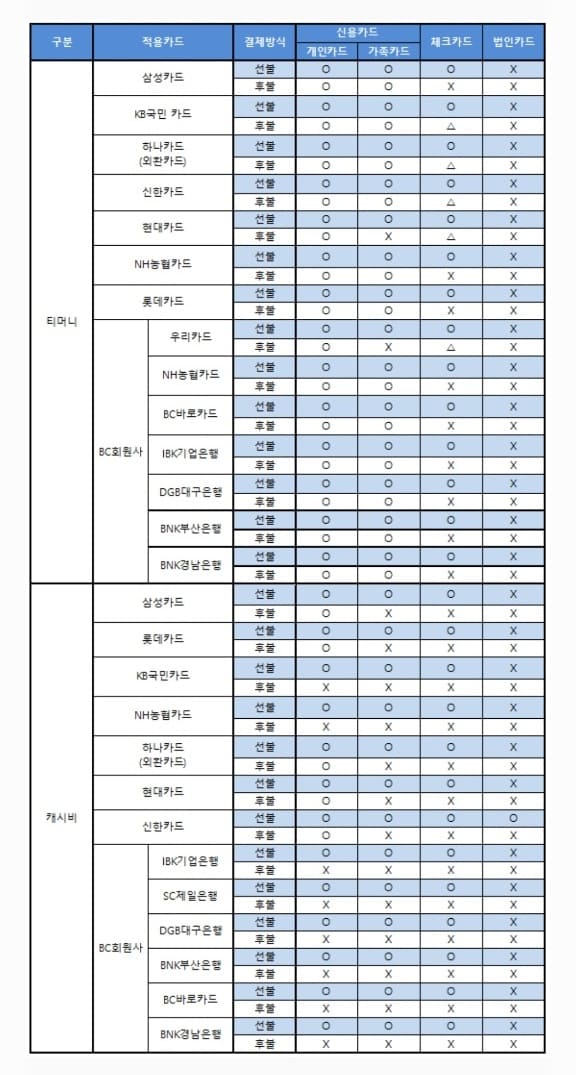 - 티머니 후불 사용 시 혜택 적용 카드사 : 신한카드, 현대카드, 농협카드, 삼성카드, 하나카드, KB국민카드, BC카드, 롯데카드
