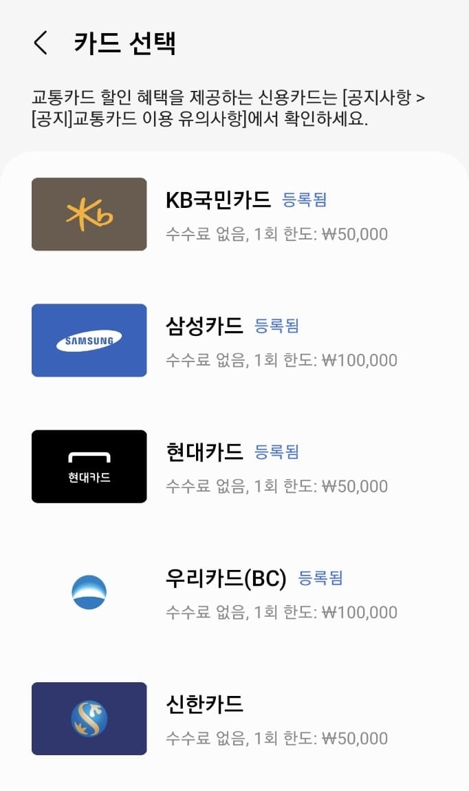 교통카드로 등록 가능한 카드 리스트는 아래와 같습니다.