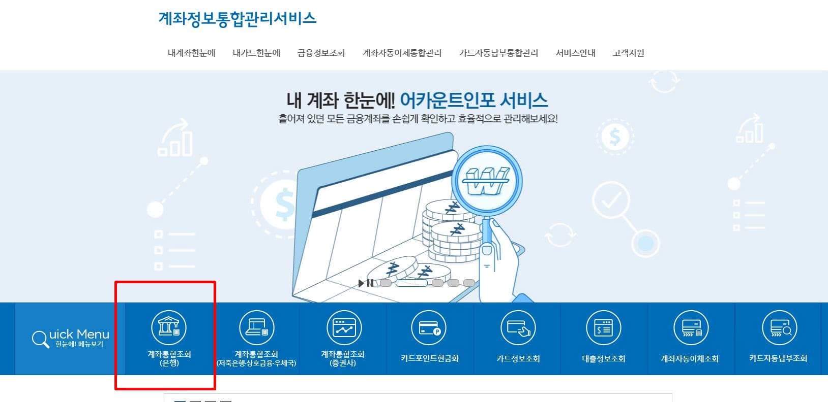 2. 사이트 메인에 [계좌통합조회(은행)] 을 선택해주세요.