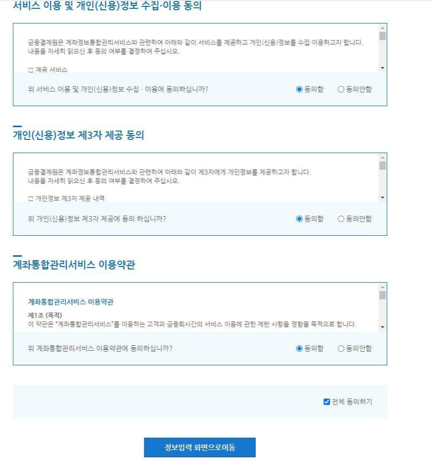 3. 서비스 이용 및 개인(신용)정보 수집·이용 동의, 개인(신용)정보 제3자 제공 동의, 계좌통합관리서비스 이용약관의 동의함을 선택 하신 후 [정보입력 화면으로이동] 버튼을 선택하여 다음단계로 이동해주세요.