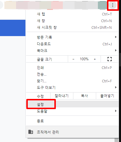 1. 크롬을 열고 우측 상단에 점 세개를 선택한 후 설정을 선택합니다.
