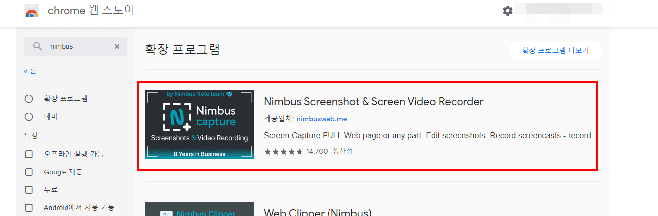 6. 저는 Nimbus 라는 캡쳐프로그램을 검색하였는데요 검색결과에 나온 프로그램을 선택해주세요.