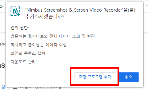 8. 아래와 같이 얼럿창이 발생하면 [확장프로그램 추가] 버튼을 선택해주세요.