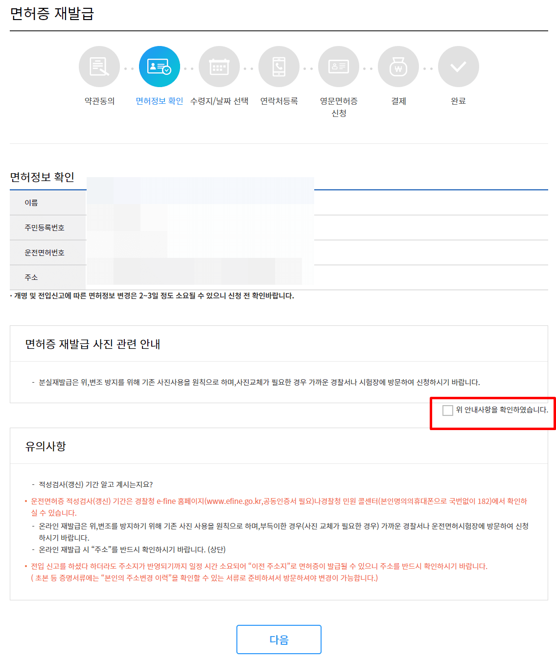 5. 본인의 면허정보를 확인한 후 약관 동의 후 다음 으로 이동해주세요.