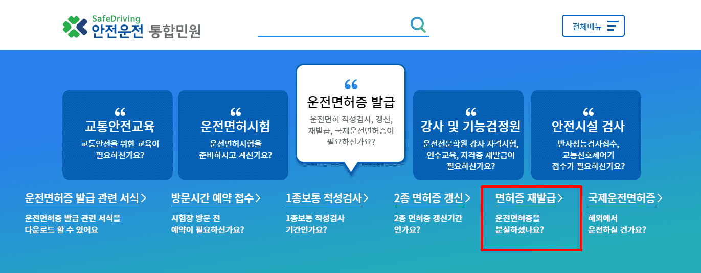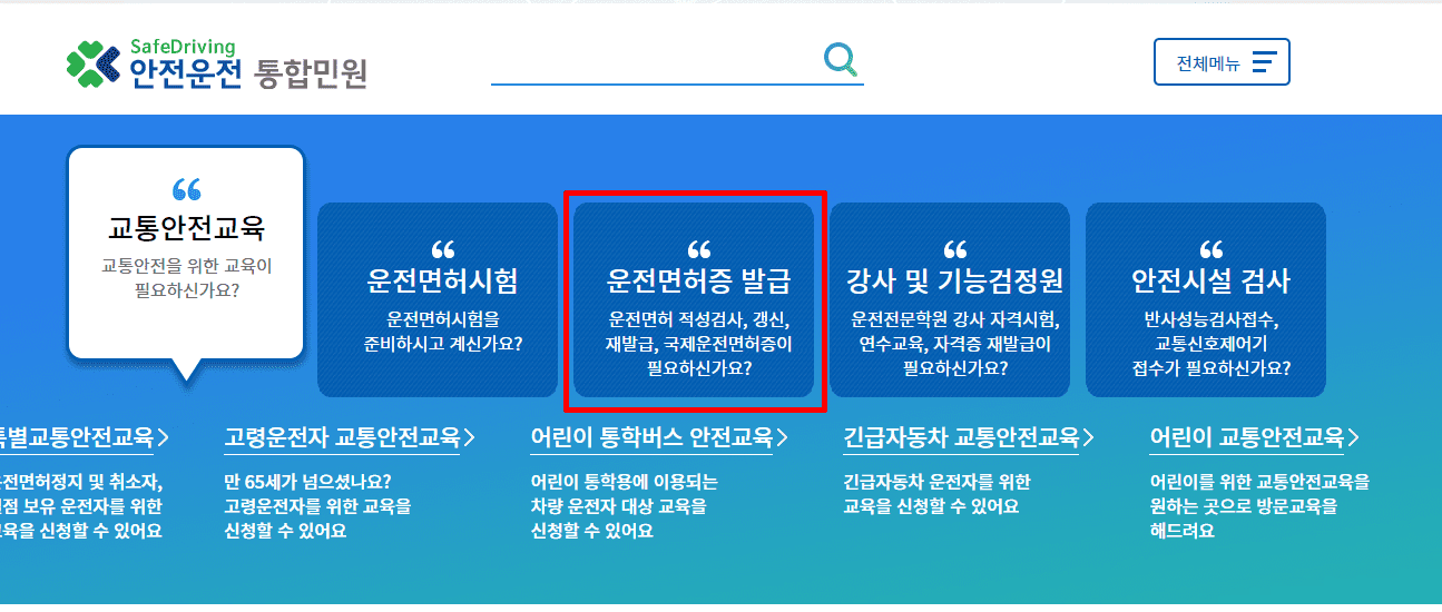 2. 사이트 진입 후 메인화면에 있는 [운전면허증 발급] 을 선택해주세요.