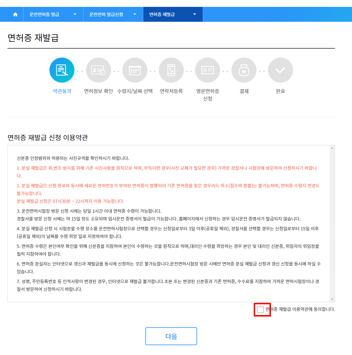 4. 본인확인이 완료되면 면허증 재발급 신청 페이지로 이동합니다. 아래 화면에서 약관동의를 진행해주세요.