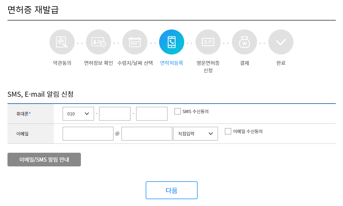 7. 재발급 시 알림을 받고자 하는 정보를 입력해주세요.