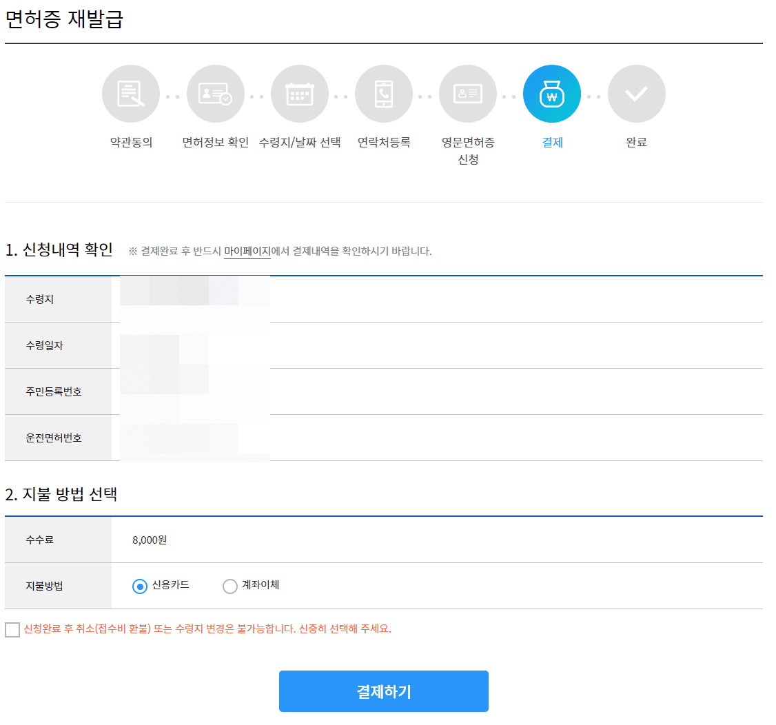 9. 신청내역 확인하신 후 수수료 지불방법을 선택하여 결제를 진행해주시면 신청완료됩니다.