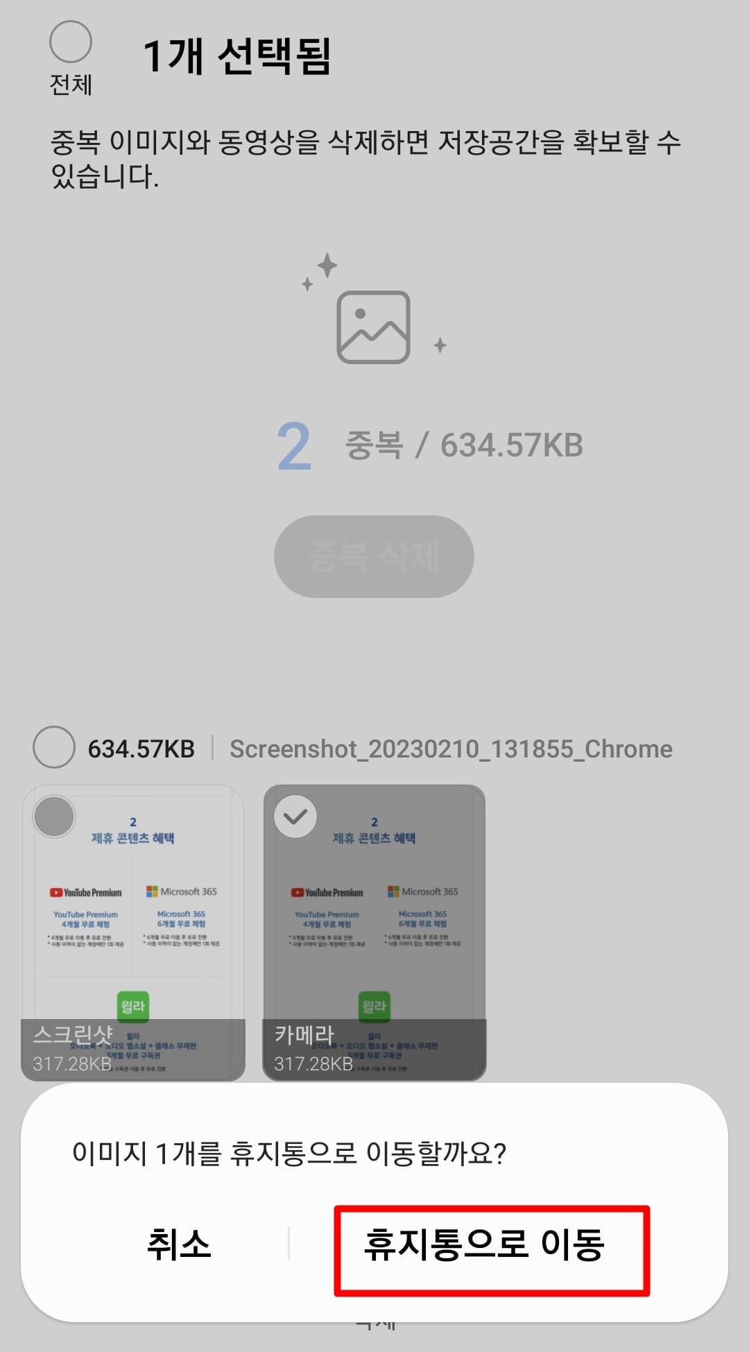 5. 중복된 사진들 중 하나를 제외한 나머지 사진이 자동 선택되며 확인 후 [삭제]를 진행하여 [휴지통으로 이동]을 선택하시면 정리가 완료됩니다.