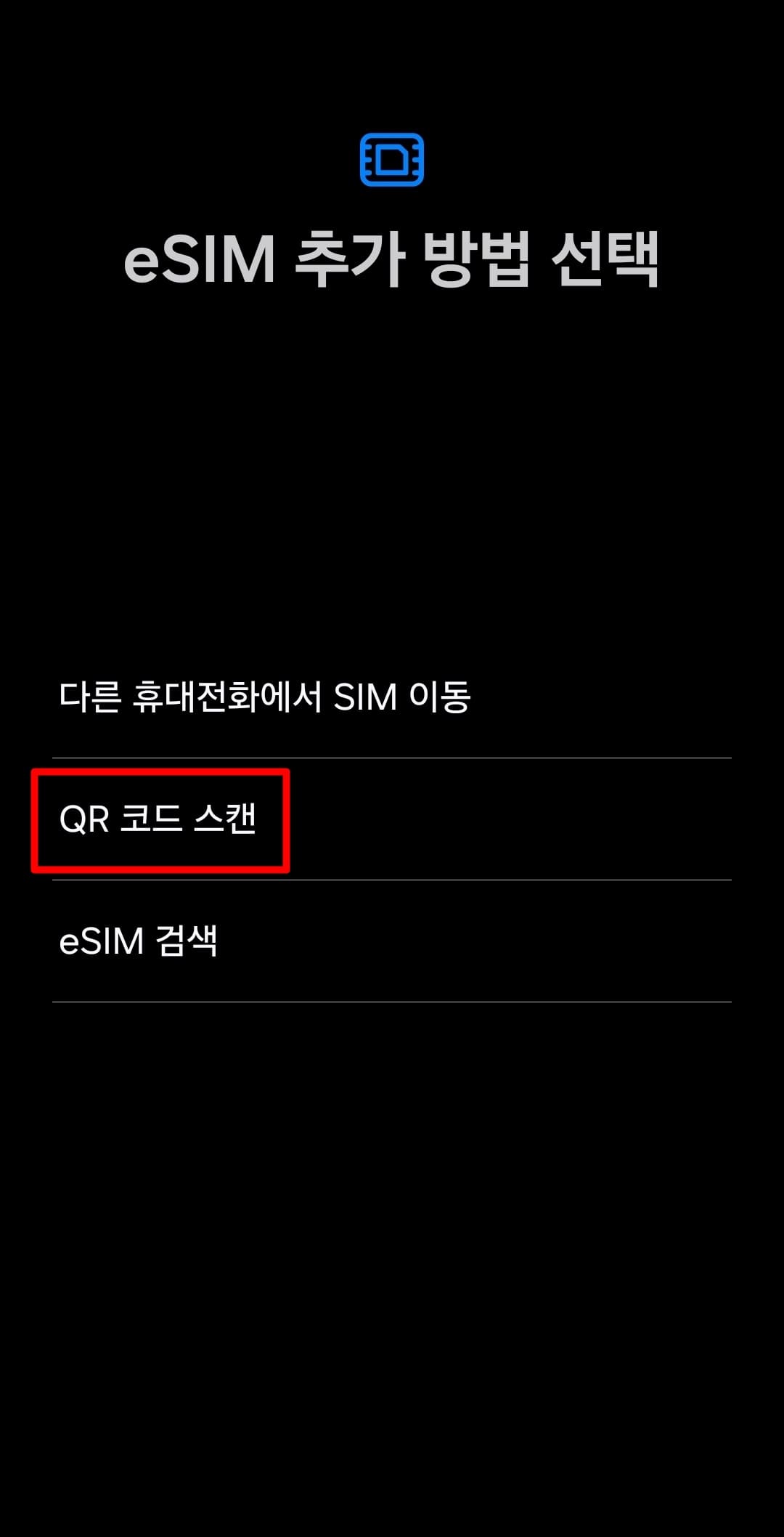 3.eSIM 추가 방법 선택 화면에서 [QR 코드 스캔] 을 선택해주세요.