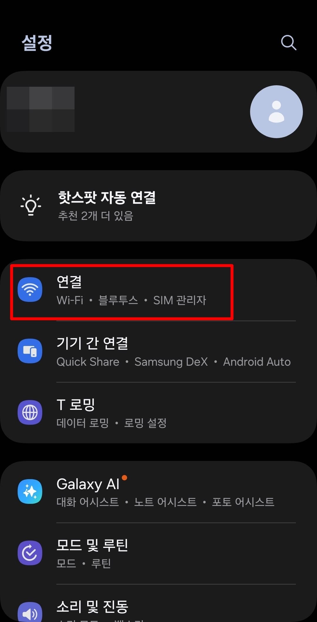 2. 설정 메뉴를 선택하여 아래 화면에서 [연결] 을 선택해주세요.