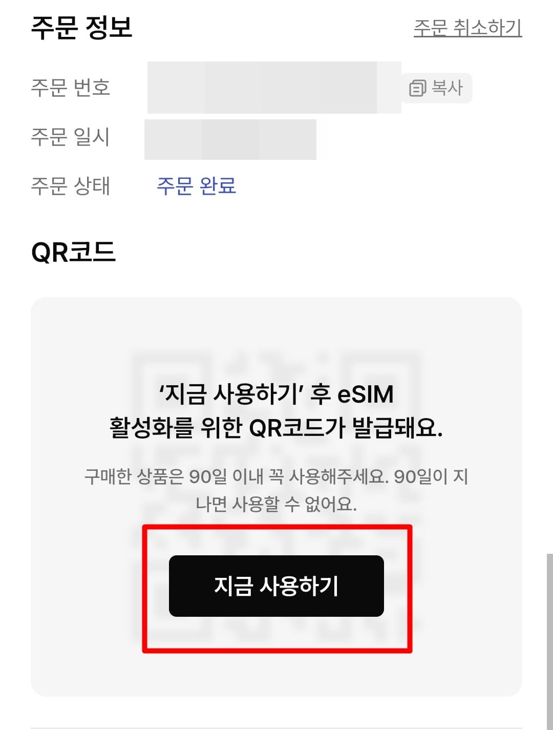 1. 구매처에서 [지금 사용하기] 버튼을 선택하여 QR코드를 활성화해주세요.