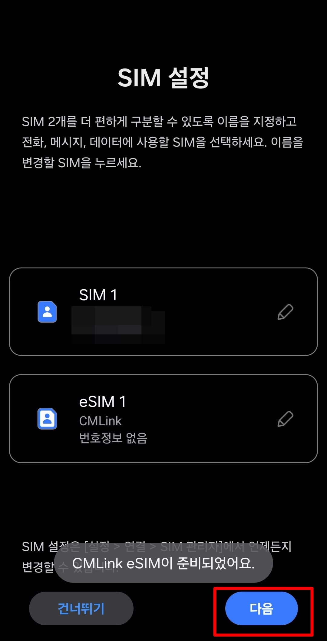 4.아래와 같이 SIM 정보를 확인한 후 CMLink eSIM을 추가하시면 됩니다.