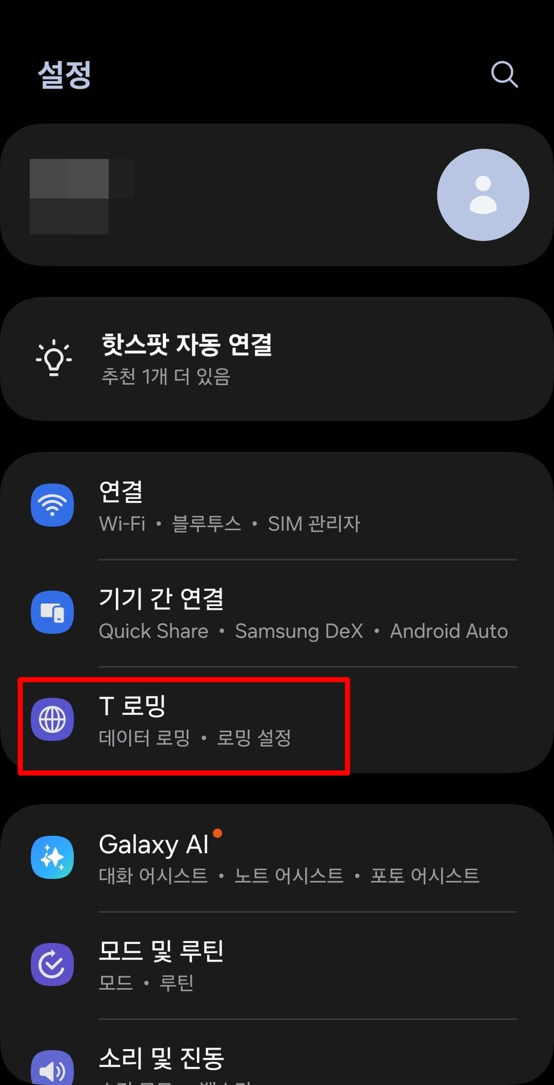 1. 설정 화면에서 'T 로밍' 항목을 선택해주세요.