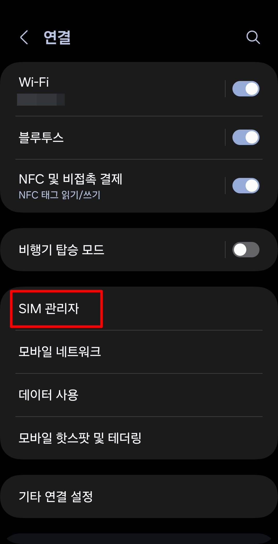 연결 화면에서 [SIM 관리자] 항목을 선택해주세요.
