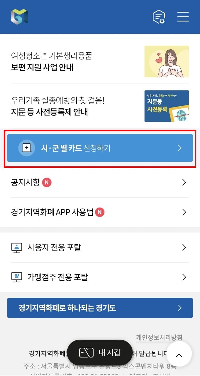 2. APP 실행 후 메일 화면 하단에 있는 [시·군 별 카드 신청하기] 버튼을 선택해주세요.