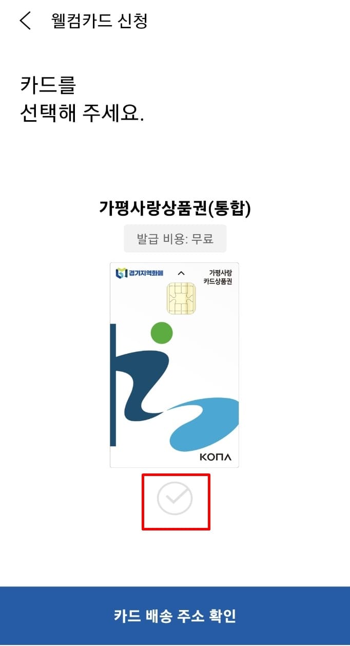 4. 카드를 선택해주히고 아래 표시된 부분을 체크해주신 후 [카드 배송 주소 확인] 버튼을 선택해주세요.