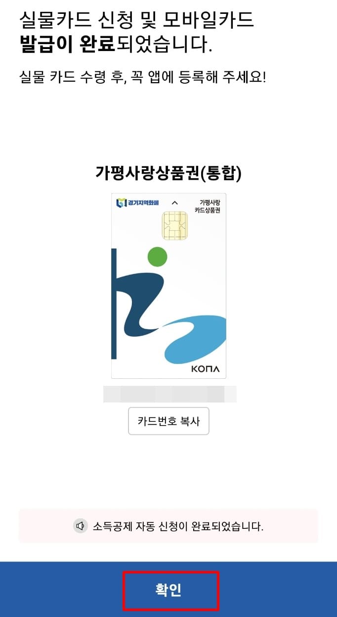 6. 다음과 같이 실물 카드 신청 및 모바일 카드 발급 완료 화면으로 이동됩니다.