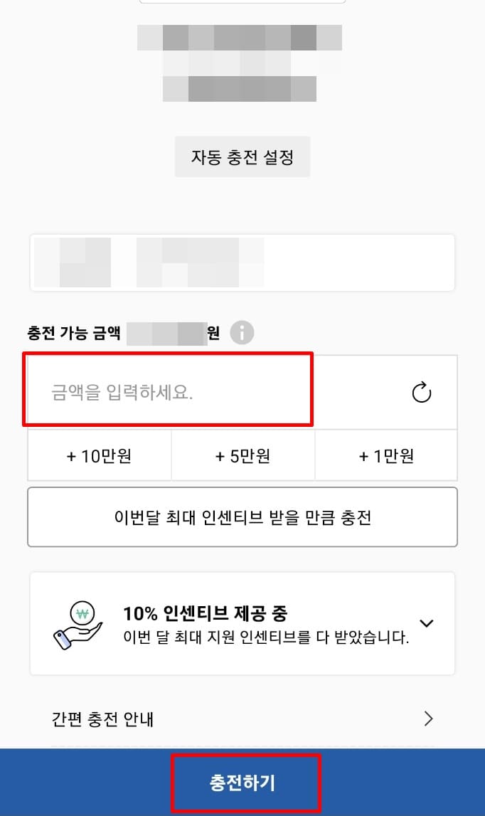 충전할 금액을 입력하신 후 [충전하기] 버튼을 선택하여 충전을 진행해주세요.