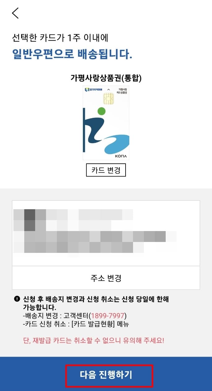 5. 주소를 확인해주신 후 [다음 진행하기] 버튼을 선택해주세요.