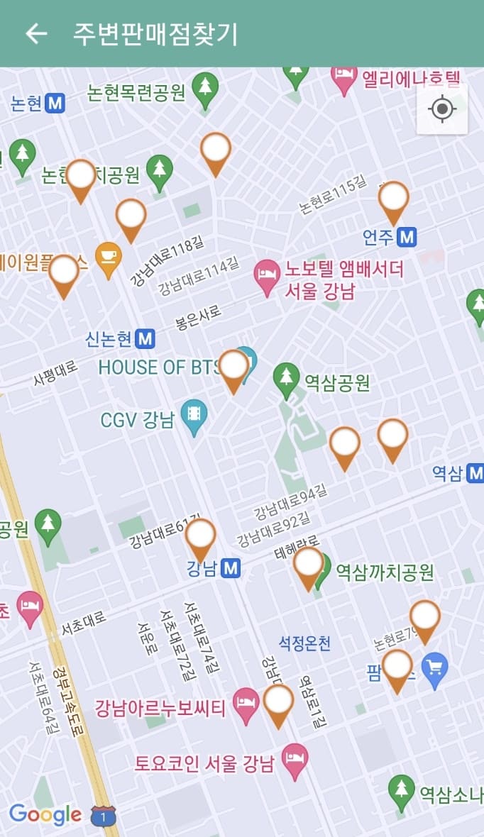 2. 주변 판매점 찾기 화면에서는 현재 위치 혹은 지도 내 위치를 이동하여 로또 판매점을 아래 화면과 같이 확인하실 수 있습니다.