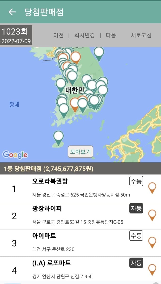 아래와 같이 1023회 1등 당첨 판매점 리스트 (서울 광진구에 있는 오로라 복권방, 서울 구로구에 있는 광장 하이퍼, 대전 서구에 있는 아이마트 등)가 노출됩니다.