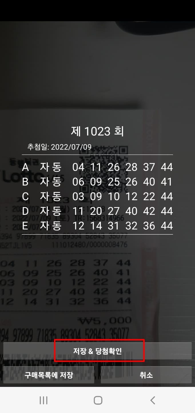 인식이 완료된 후 아래와 같이 [저장 & 당첨 확인] 버튼을 선택해주세요.