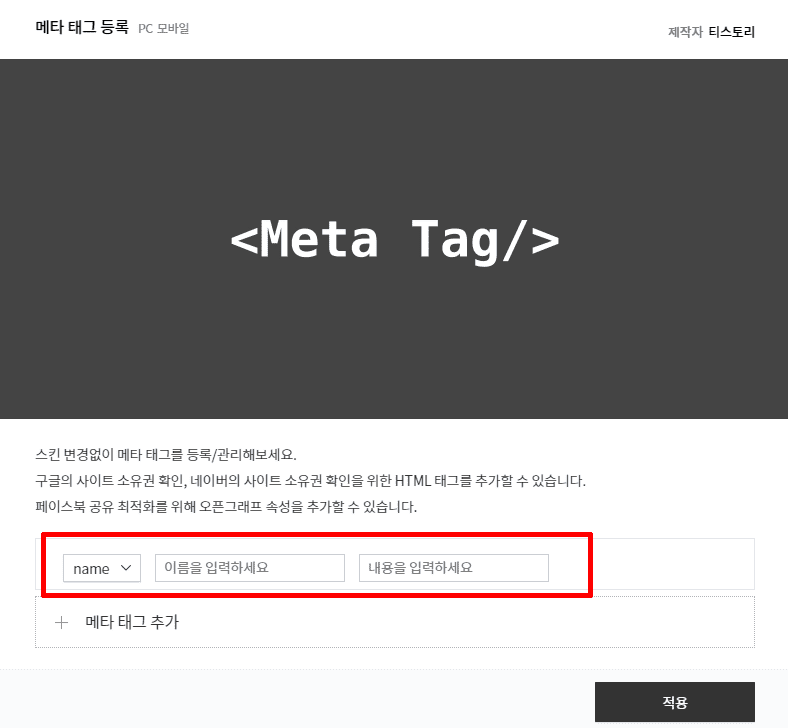9. 아래 좌측 화면과 같이 [ + 메타태그 추가] 버튼을 선택해주세요.