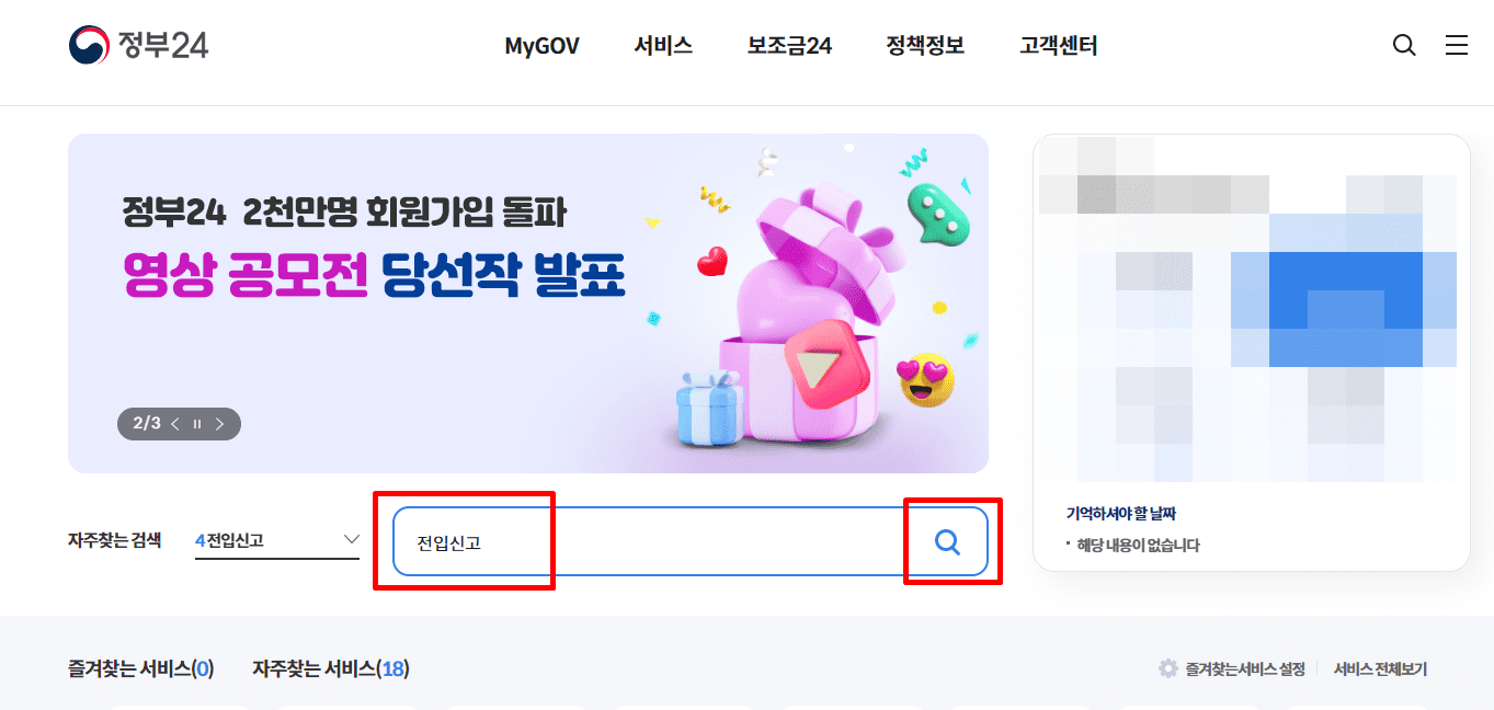 1. 정부 24에 접속하셔서 '전입신고' 검색해 주세요. 정부24 이동하기